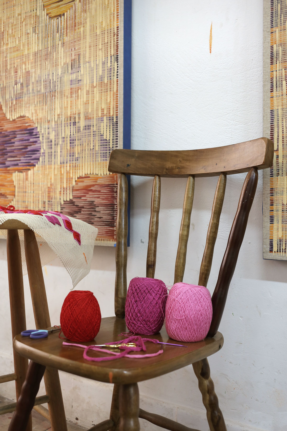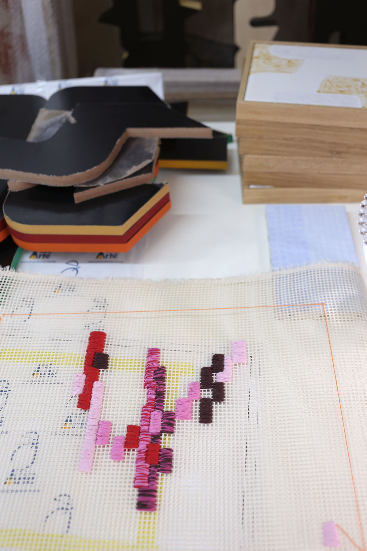Another central concern in my practice is materiality. I chose pure linen as the primary support for my paintings and for part of my embroidery works, which share mesh-based grounds such as needlepoint canvas and mosquito netting. Yet I also like to “listen” to what each material expresses on its own terms; I have created works on leather, jute, velvet, and ceramic tiles. Each weave — or even its complete absence, as in the smooth surface of industrial ceramic — carries its own narrative. I remain attentive to how these textures speak to the colors I lay upon them, to the dialogue that unfolds between surface and pigment.