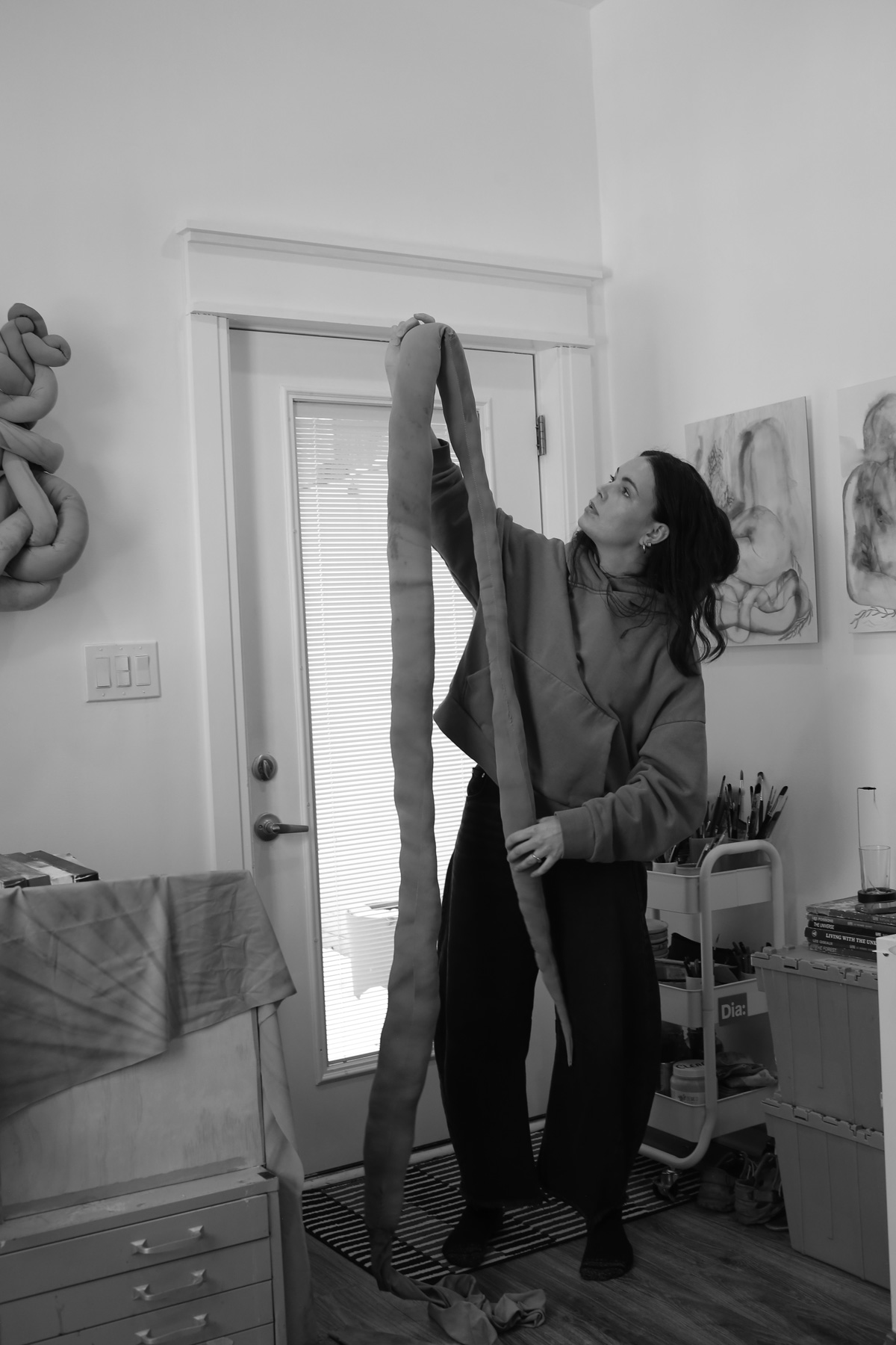 Even before moving into soft sculpture, these intertwined bodily forms had long been recurring in my paintings and works on paper. They feel tangible and lend themselves to sculpture, so I’d imagined them that way long before I finally brought them into three dimensions. Textile felt like an obvious choice for a few reasons. I actually went to fashion school, which turned out to be a long-winded way of realizing I was trying too hard to force my tendencies into what I thought would be a more practical career.
