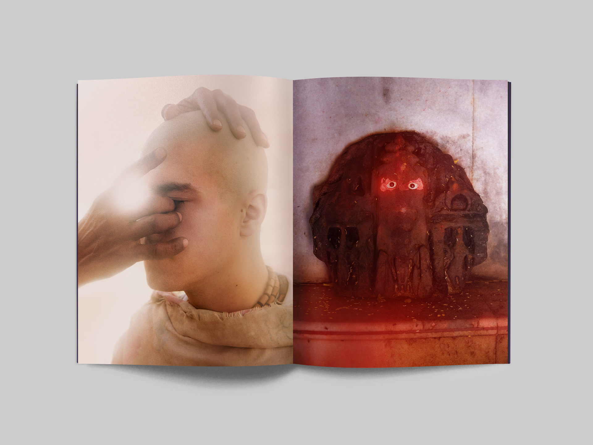 A powerful pairing near the book’s end exemplifies this sensibility. On one page, a tender ritual gesture unfolds: a hand resting on a head, another brushing across closed eyes. Opposite it sits a dark sculptural form marked by age, punctuated by two subtle points of light. Between them, Heller stages a quiet dialogue about the body as a vessel of devotion and the sites that collect devotional energy over generations.