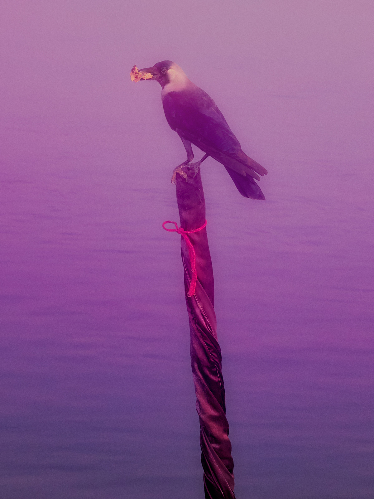 In one early image, a solitary figure stands on a wooden boat drifting over still water. The entire scene glows in violet and magenta hues, the horizon dissolved. The picture feels less like documentation than an apparition, an articulation of how memory and myth can tint experience. This is characteristic of Heller’s approach: to render scenes that are factual yet touched by something otherworldly.