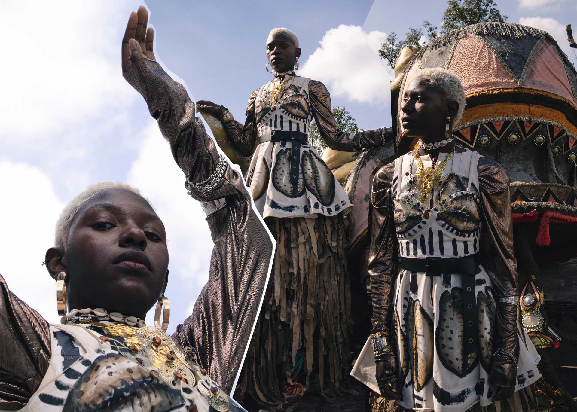 Aliás, foi bonito ouvir sobre a sua memória e te agradeço por me contar essa história. Ela me fez lembrar algumas coisas que tenho levado em consideração na minha prática artística, porque ela também gira em torno desse feitiço e dessa magia. A magia é, de alguma forma, política porque ela movimenta a subjetividade. Eu me lembro da primeira vez em que desfilei em uma escola de samba. Todo mundo já estava fantasiado e para chegar à concentração era preciso passar pelos carros alegóricos. O caminho parecia como um trajeto para chegar ao Orum [mundo espiritual, céu ou dimensão invisível na cosmologia iorubá, paralelo ao Ayê, que representa o mundo físico]. A experiência visual tomou todo o meu corpo. A caminhada parecia um sonho em que eu pisava em algo muito leve e encontrava com a minha própria realidade, como num espelho, porque para onde eu olhava, a maioria das pessoas eram pessoas negras. Eu me arrepio pensando nisso. Atravessar o Sambódromo do Anhembi foi como um ritual de passagem, foi algo muito importante para mim. Pensei em um tio meu, o Donizete que era candomblecista e babalorixá. Essa relação entre carnaval e espiritualidade me impactou, e acabei levando essa experiência e a ideia do feitio manual do carnaval para toda a minha produção artística.