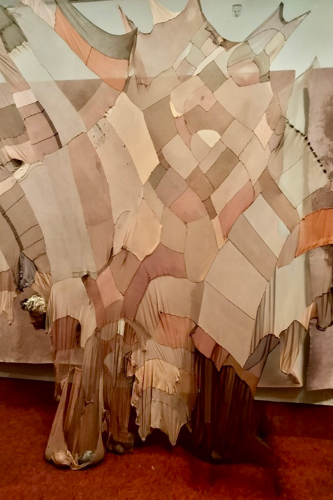 AA: Que legal, Karlla! A questão do têxtil também está muito embrenhada no carnaval. Eu tenho pensado muito sobre assemblagem, que é uma justaposição de matérias. Eu tenho utilizado como estrutura o costeiro do carnaval e todo tipo de construção de ferragem, e aí eu dublo com tecido e transformo essa tela a partir daí. Enfim, é um objeto de ferro, com uma estrutura que eu encapo com EVA e com tecido, e depois aplico bordado e pintura. E gosto de pensar que, mesmo para os artistas que pintam, a tela é um tecido. Também é têxtil o que acontece ali.