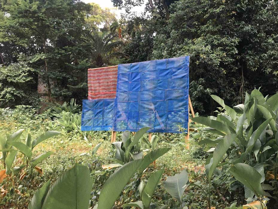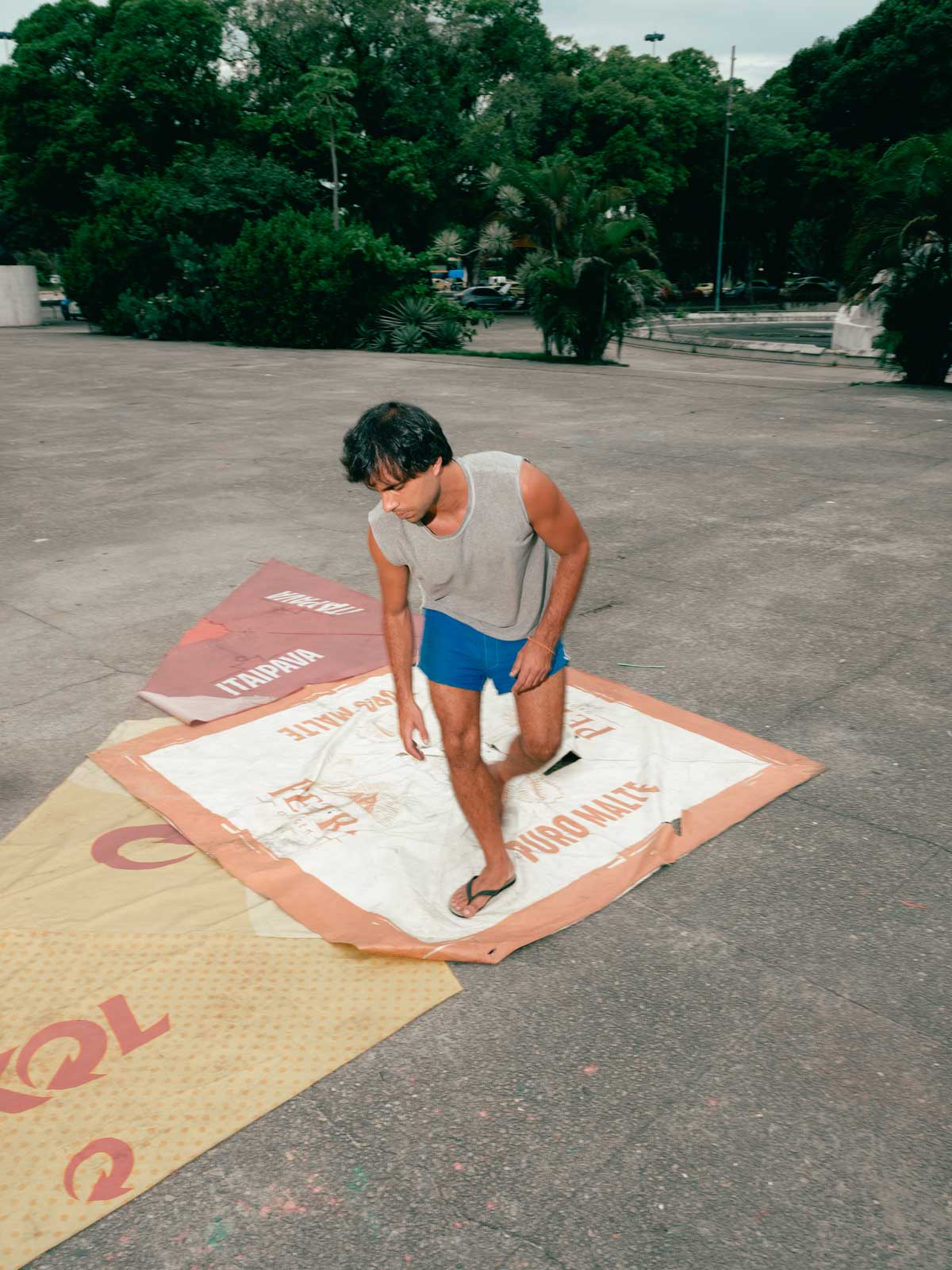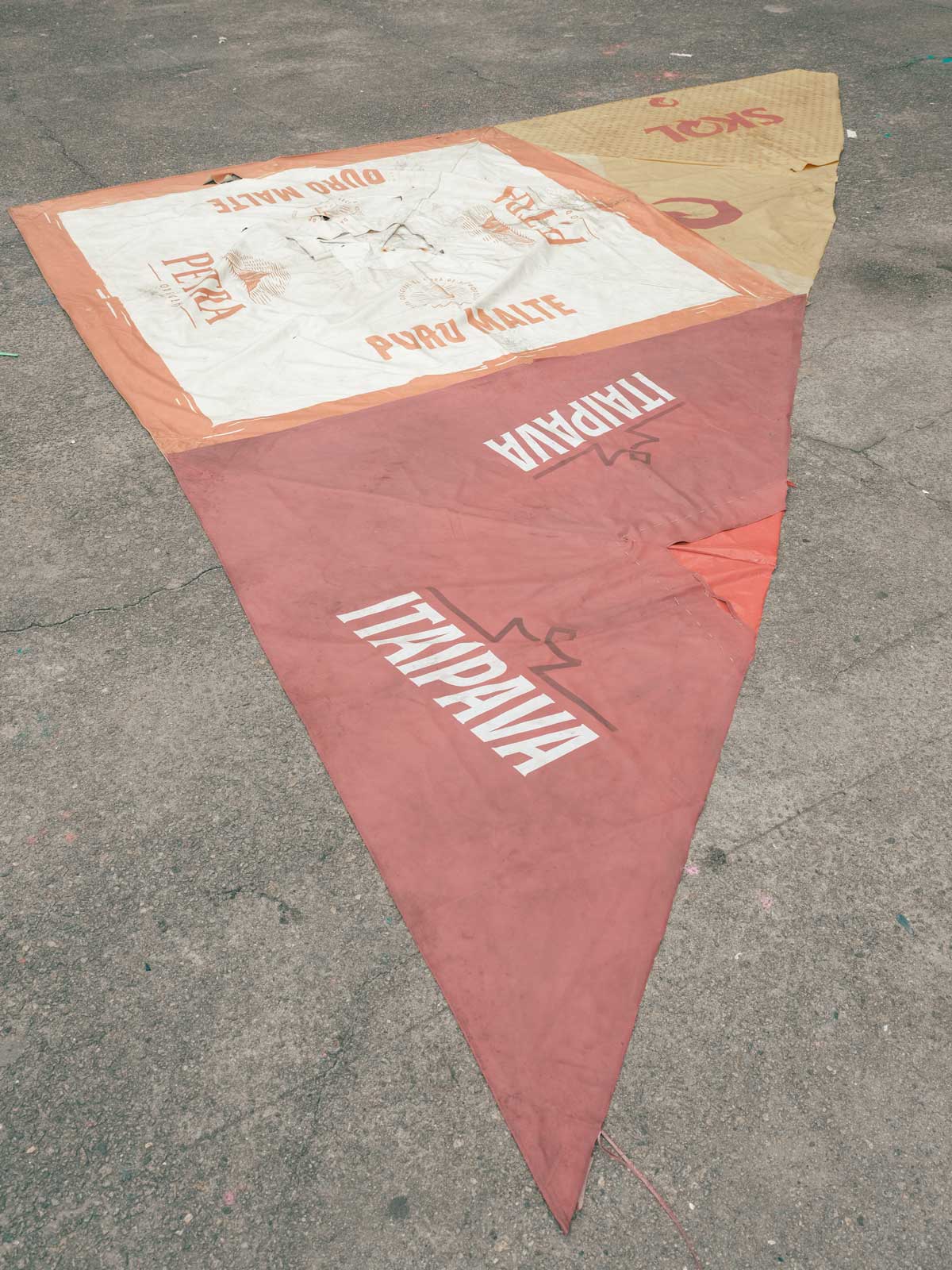 Ele coleta os restos das ruas e praias do Rio — guarda-sóis queimados de sol, toalhas desbotadas, tecidos das icônicas cadeiras de praia, sacolas plásticas amassadas, caixas térmicas de isopor das rodas de samba e as infinitamente descartadas Havaianas. Você conhece esses objetos — aqueles que se tornam emblemáticos das cidades, especialmente no Sul Global? Esses materiais são a força vital do tecido social e urbano do Rio, incorporando literalmente sua vibração, precariedade e cores. Quantos chinelos quebrados cruzam nossos caminhos todos os dias? Quantas vidas eles já sustentaram?
