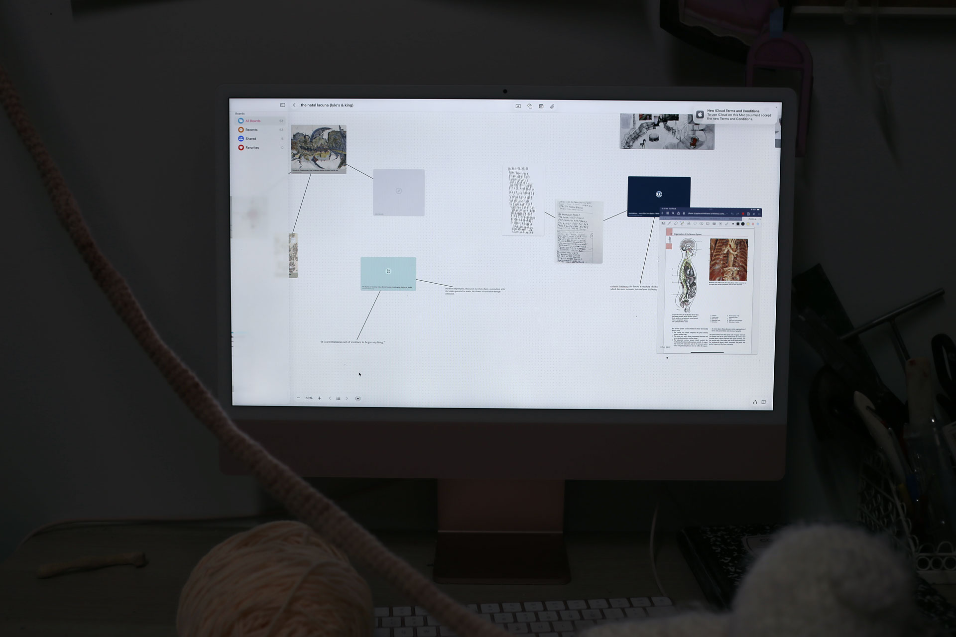 Todos os meses crio um novo “mapa-aranha”. É algo como um mapa mental que costura links, fotos, esboços e anotações que cercam e se ramificam a partir de um tema específico (11). O mapa-aranha é um documento vivo que existe ao longo dos primeiros e últimos dias de cada mês. Quando não estou no estúdio, trato o mapa-aranha como um terreno de descarte: uma palavra que achei interessante, um livro recomendado, uma foto de uma rachadura na calçada preenchida com asfalto em vez de cimento. Quando sinto o nó se formando na palma da mão por causa do movimento repetitivo do crochê, mudo para limpar esse terreno. Capturas de tela são organizadas, começo a analisar melhor por que algo chamou minha atenção e encontro padrões nos achados. O painel em que trabalho naquele mês pode não ter nada a ver com o que está em produção no momento. Gosto de permitir que uma ideia rumine, que germine. Espero que o impulso se torne tão grande que me faça parar no meio do caminho (esta peça foi iniciada no meio de uma frase do meu livro de tese) (12). Esse método só funciona porque venho fazendo esse processo de coleta e acumulação há anos; neste estágio, ele é autossustentável, mesmo que eu parasse de consumir informação. Por mais produtivo que seja para a forma como meu cérebro funciona, ele dificulta quando trabalho para uma exposição, pois prazos importam e não costumo deixar que uma peça seja ditada por uma restrição temporal. Isso exige uma alocação adequada de foco; preciso adiar bifurcações da pesquisa por ora, mas isso permite que o desejo pelo que quero explorar e trabalhar se torne cada vez mais urgente.