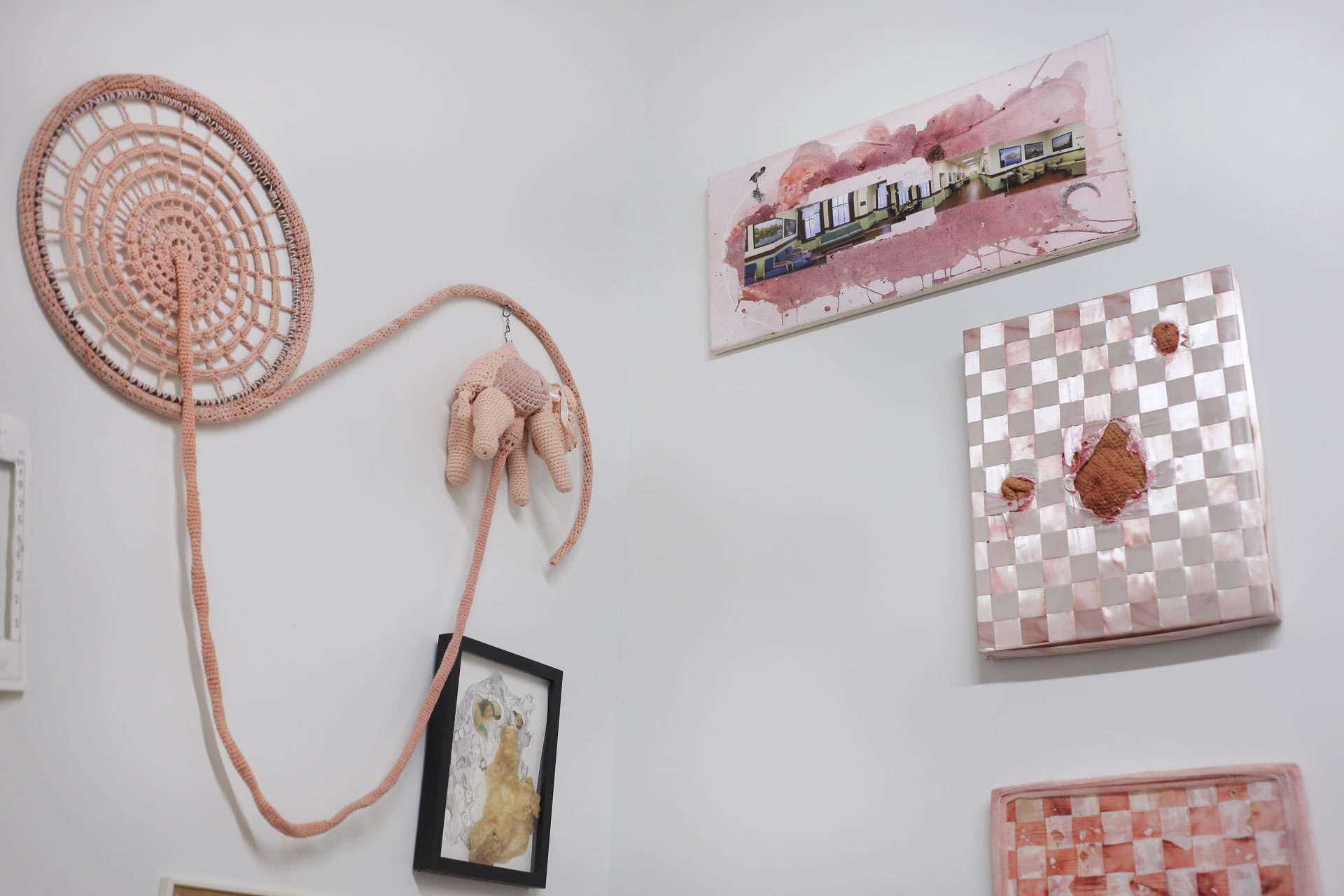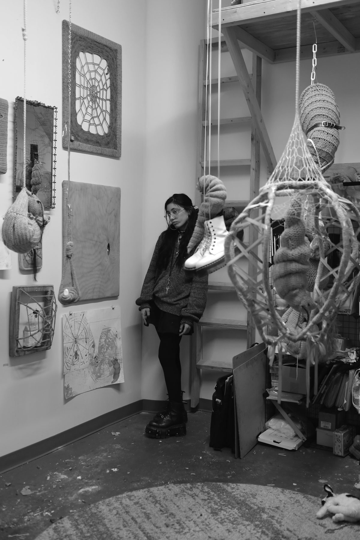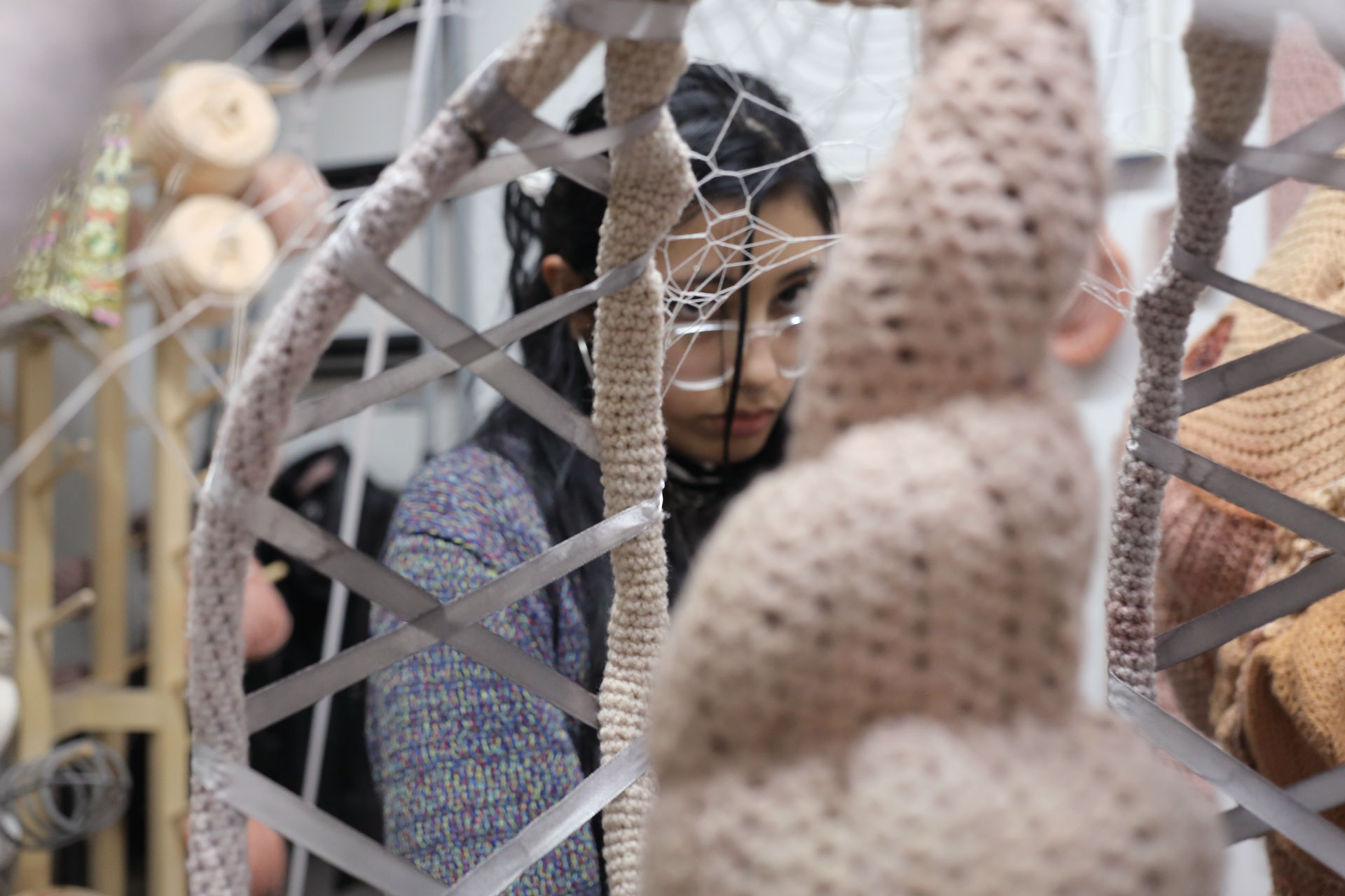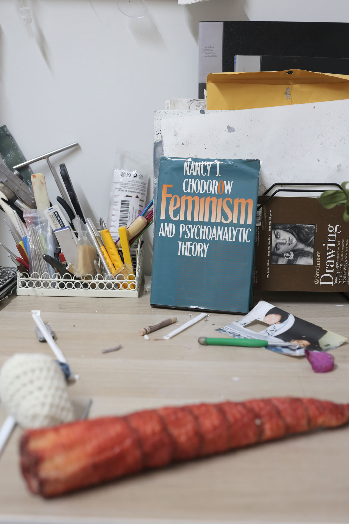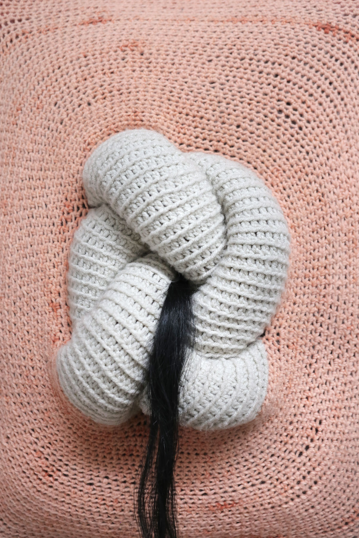 Vejo todo o labor que coloco na minha arte como Trabalho — não trabalho definido por um sistema que depende da exploração dos outros, mas trabalho definido por suas propriedades de realização. Pode ser prazeroso, mas muitas vezes é árduo, irritante ou penoso, com a recompensa encontrada no resultado ou na conclusão: a jouissance (6) do labor. Minha rotina é rigorosa e a implementação de uma disciplina estrita carrega o mais leve odor de uma educação católica. De segunda a sexta, frequento o estúdio das 9h às 19h ou das 10h às 19h. Às segundas e sextas, acordo às 7h, faço minha rotina matinal de contorcionismo ou yoga (em esquema alternado para não me machucar) e chego ao estúdio às 10h. Entro então numa sala sem janelas de 3,35 x 4,88 m e fecho as portas até as 19h. De terça a quinta, acordo às 6h, faço minha rotina matinal e chego ao estúdio às 9h. Minha rotina, dentro e fora do estúdio, é enraizada numa busca por salvação — ou talvez como forma de penitência. Não há um minuto em que eu não esteja ouvindo algo: meus banhos são cronometrados por vídeos de notícias de dez minutos; meus ciclos de crochê, por palestras online e podcasts; meus dias, por audiolivros; a música que ouço é familiar o suficiente para que eu possa ler enquanto ela toca. Isso permite que minha mente permaneça em movimento contínuo, enquanto minhas mãos operam de maneira semelhante. Estou praticamente sempre fazendo crochê: faço no caminho até o trem, no metrô e, claro, no estúdio. Isso é mais memória muscular do que qualquer outra coisa — obsessão mais do que tarefa ou obrigação. O crochê é uma forma de marcar o tempo; é a prova de que existo. O tempo pode parecer parado ou até fraturado, mas sei que estou presente em seu rastro, pois há um produto resultante do insumo do movimento; faço de mim mesma uma máquina, pura.