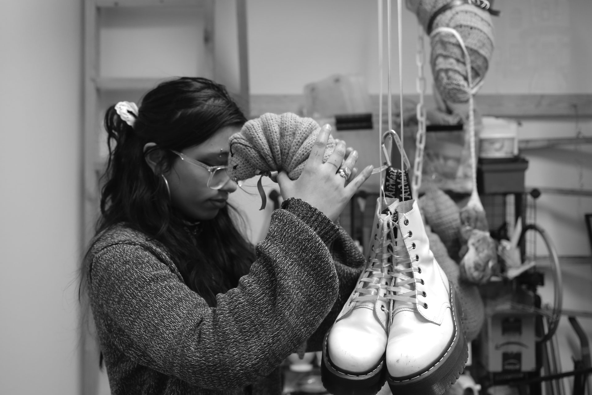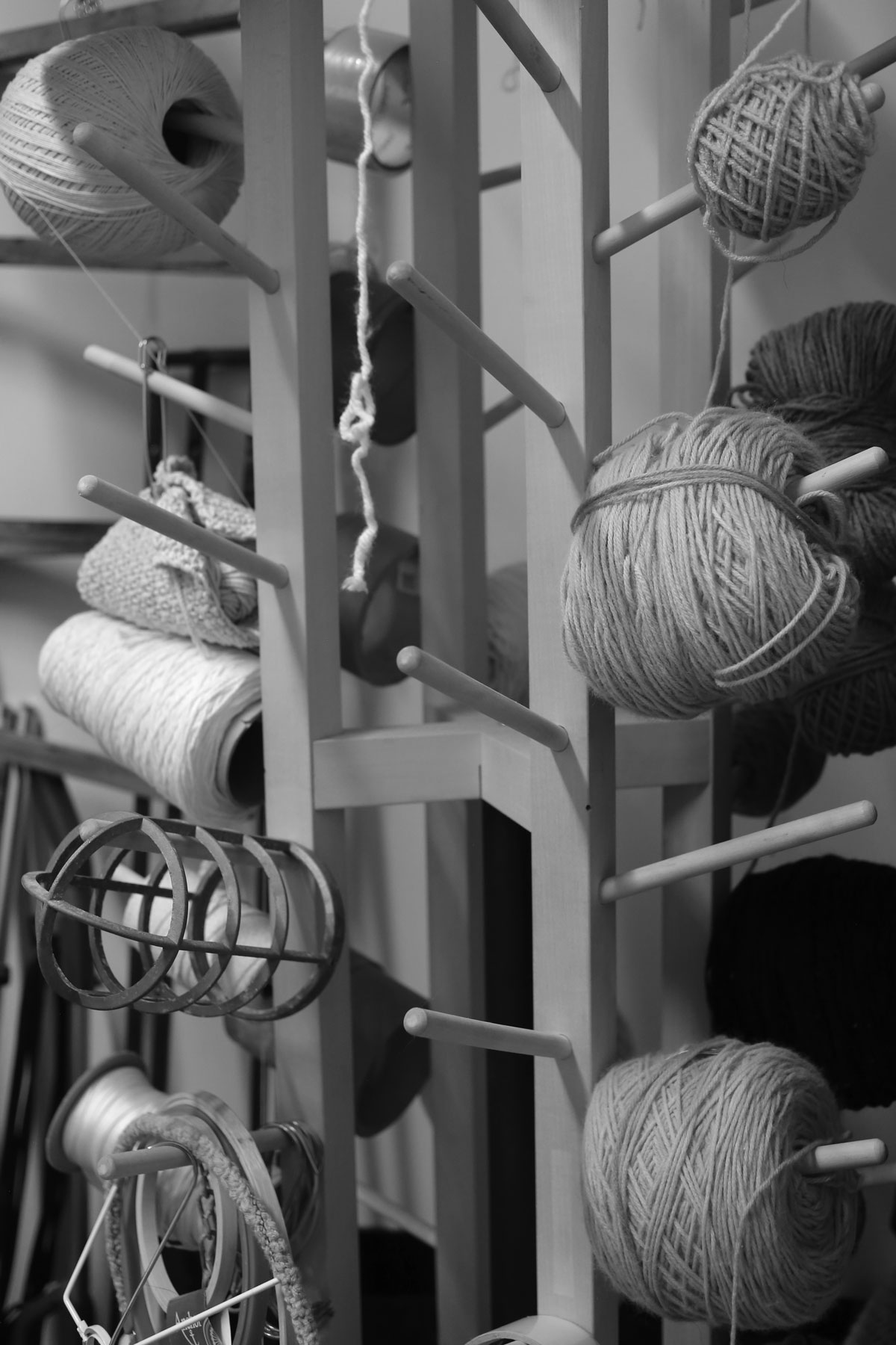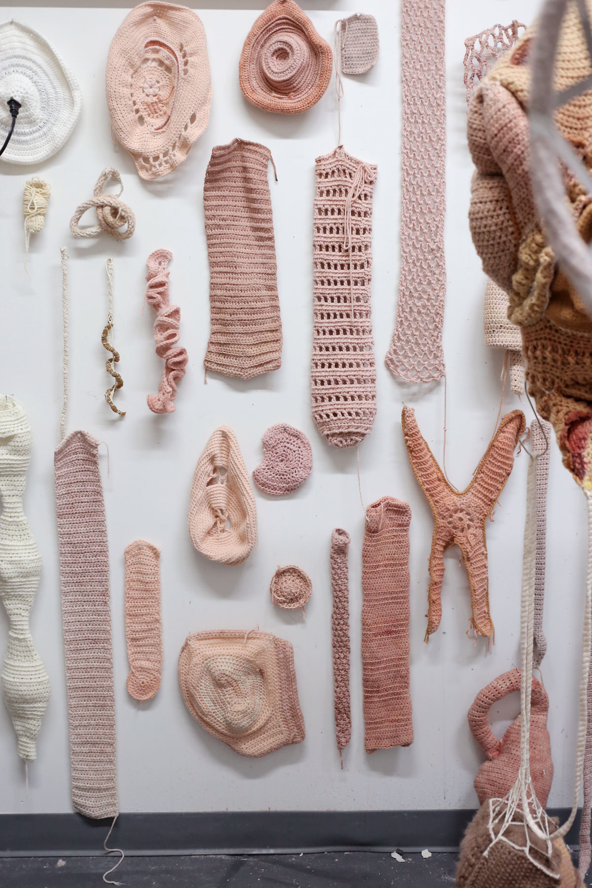 Aloco propositalmente pontos e padrões mais simples para quando estou andando ou lendo, e os mais intrincados para o estúdio. O zumbido de toda a prática é guiado por um movimento meditativo. Consigo fazer crochê sem olhar; poderia fazê-lo atrás das costas e, muitas vezes, faço enquanto leio. Isso é, claro, apenas uma faceta da vida em estúdio. As tarefas administrativas são um aspecto não dito para a maioria dos artistas — e também o menos prazeroso. É isso que tiro da frente primeiro quando “bato o ponto”, permitindo-me a liberdade de ir e voltar entre peça, experimento e peça, em todos os seus estágios e níveis ao longo das horas restantes do dia.