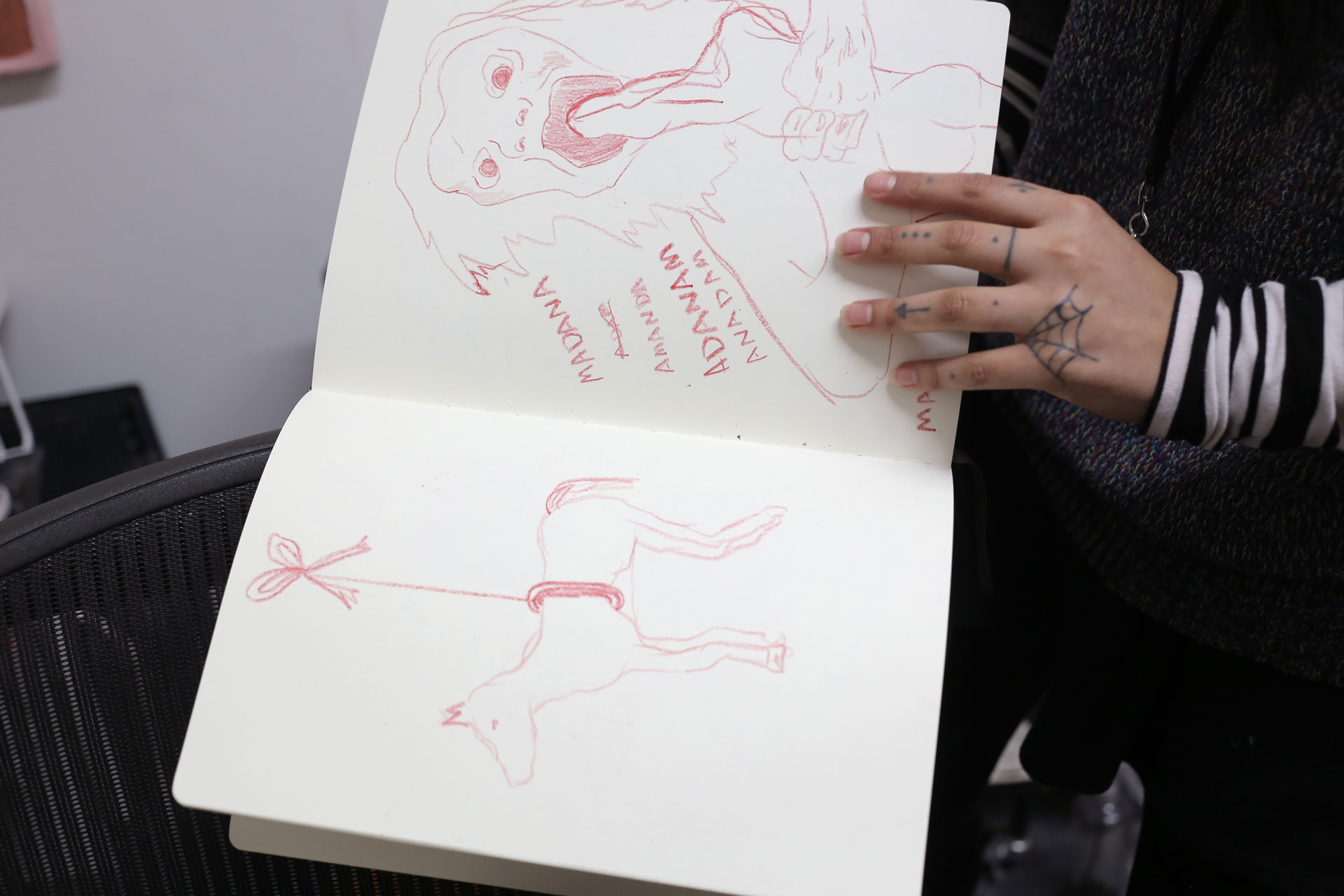 O crochê é guiado por um plano definido, porém flexível: o número de pontos, o padrão, os aumentos e diminuições etc. Todo o meu Trabalho começa com um esboço. Mantenho um caderno de desenhos de forma ativa há quatro anos. Já acumulei cerca de dez, todos datados. Folheio-os, reescrevo anotações, lembro-me do que estava pensando em determinado momento. Embora minha arte seja muito tátil e material, a internet — em toda a sua ambiguidade amorfa — funciona como subtexto. Criada na internet e fascinada pelas conexões entre as coisas sou, acima de tudo, uma acumuladora de anotações digitais. Um vídeo no TikTok (7) me leva a uma busca no Google, que me leva a um blog de 2006 (8) escrito por alguém apaixonado demais pela história das colchas, que me traz a este ensaio que você está lendo agora. Palavras, imagens, sons tornam-se passagens para finais alternativos. Minha pesquisa sobre parasitas me leva a analogias sobre relações familiares, que me levam à compreensão da sociopatia no lar, que me levam ao meu irmão, que me levam a desenhar uma memória dele e de todos os seus lagartos (9) mutilados e mortos. Os loops continuam e persistem; parecem um círculo, mas são uma espiral em um plano tridimensional (10).