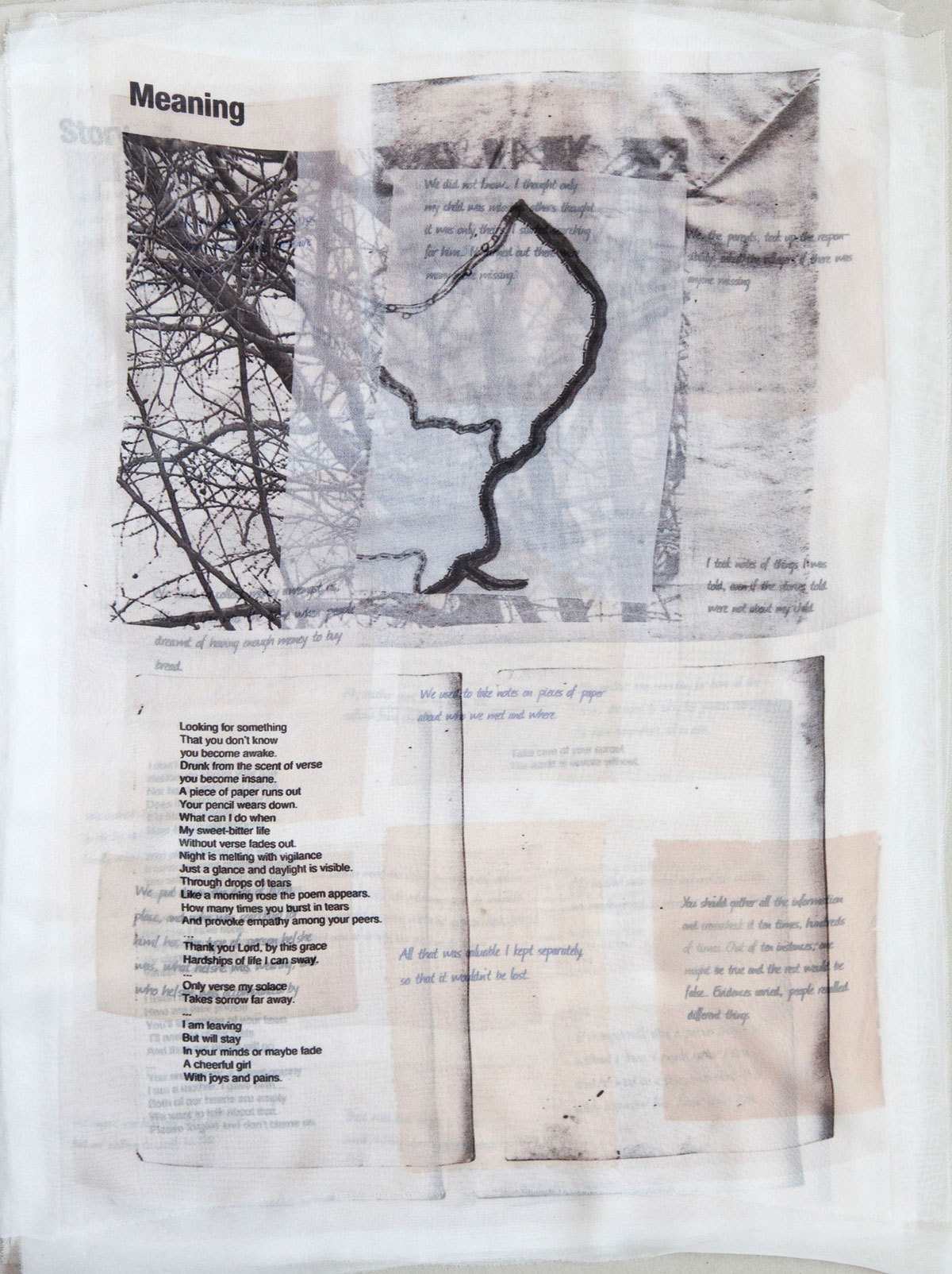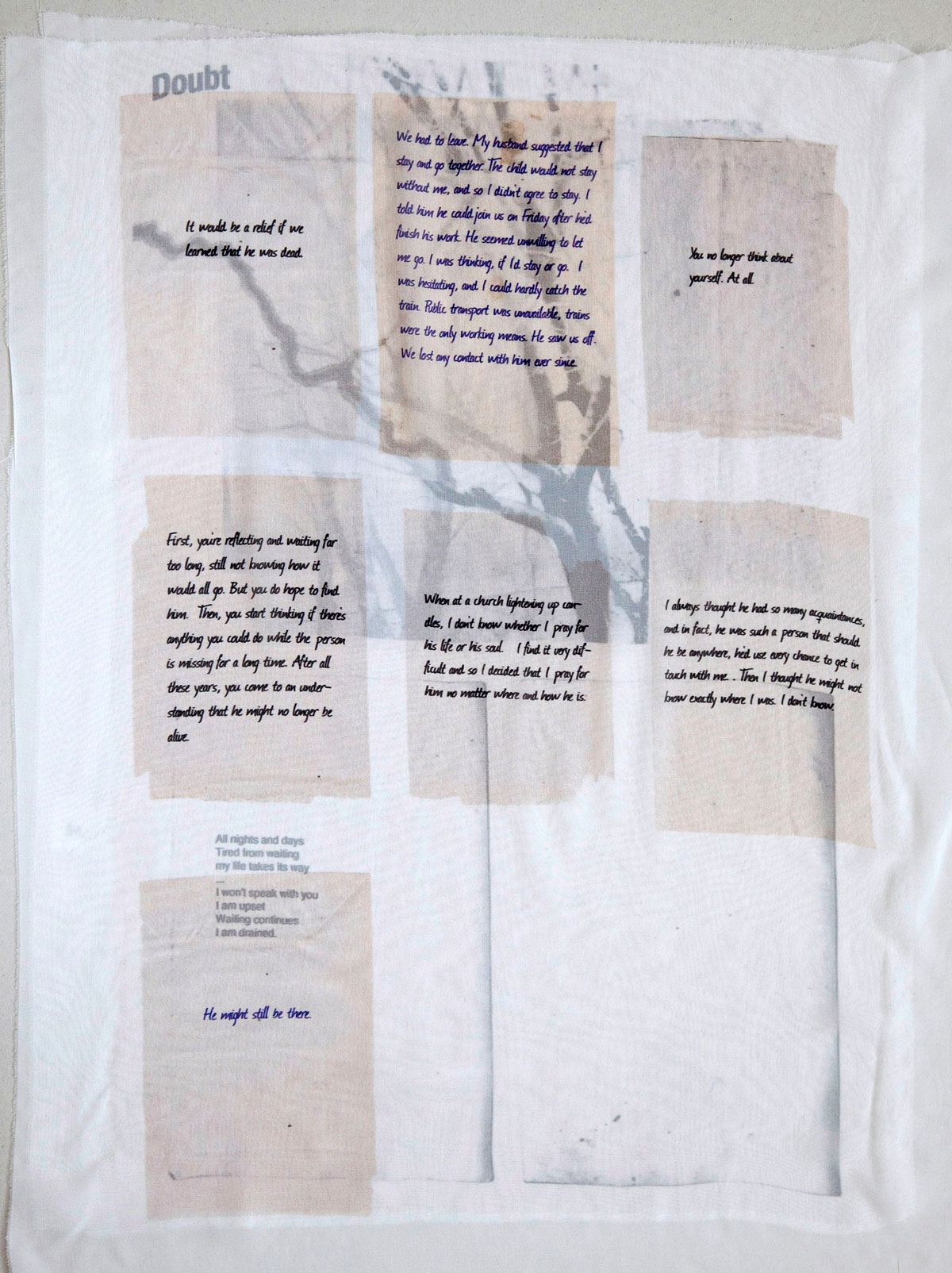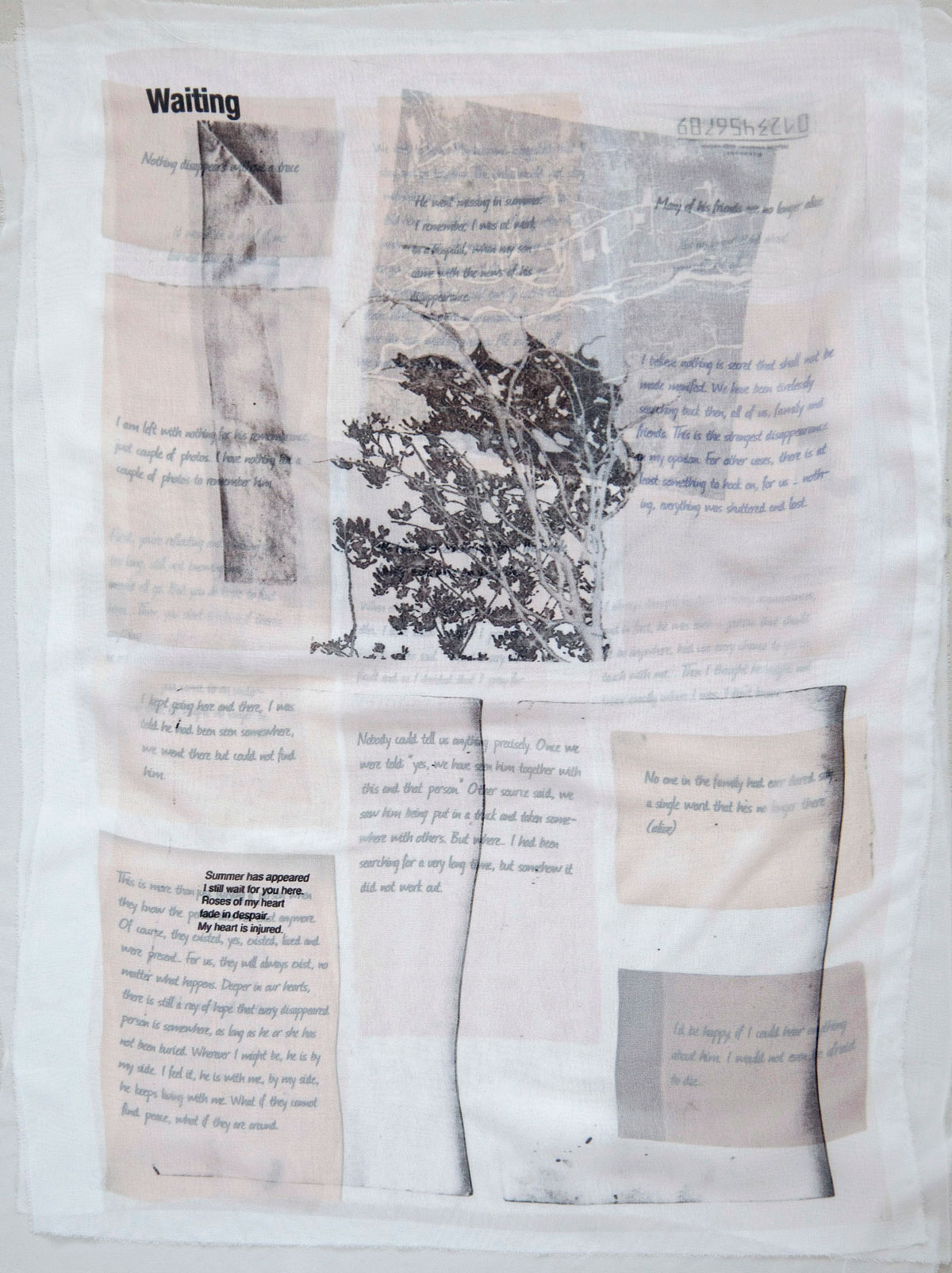 A estrutura visual do projeto se inspira na forma da árvore, um lugar recorrente de rememoração para as famílias dos desaparecidos. Chabashvili construiu uma série de árvores coladas a partir de fotografias de locais específicos, cada uma portando um aspecto distinto do desaparecimento. “Com base em fotografias de árvores de localizações geográficas específicas, colei doze árvores diferentes para o projeto. Cada árvore conta uma história que representa um aspecto do desaparecimento, de modo que as histórias são fragmentadas, assim como o próprio processo da lembrança.” Não se trata de símbolos monumentais, mas de portadores frágeis de histórias fracionadas. A “árvore dos desejos” que ela propõe é aberta, convidando mensagens de qualquer pessoa, independentemente de origem. Nesse gesto, a lembrança torna-se coletiva sem apagar a diferença; o luto é compartilhado, mas nunca homogeneizado. “Quis criar uma árvore dos desejos em que qualquer pessoa, independentemente de nacionalidade, idade, etnia ou religião, pudesse anexar uma mensagem ou um desejo.”