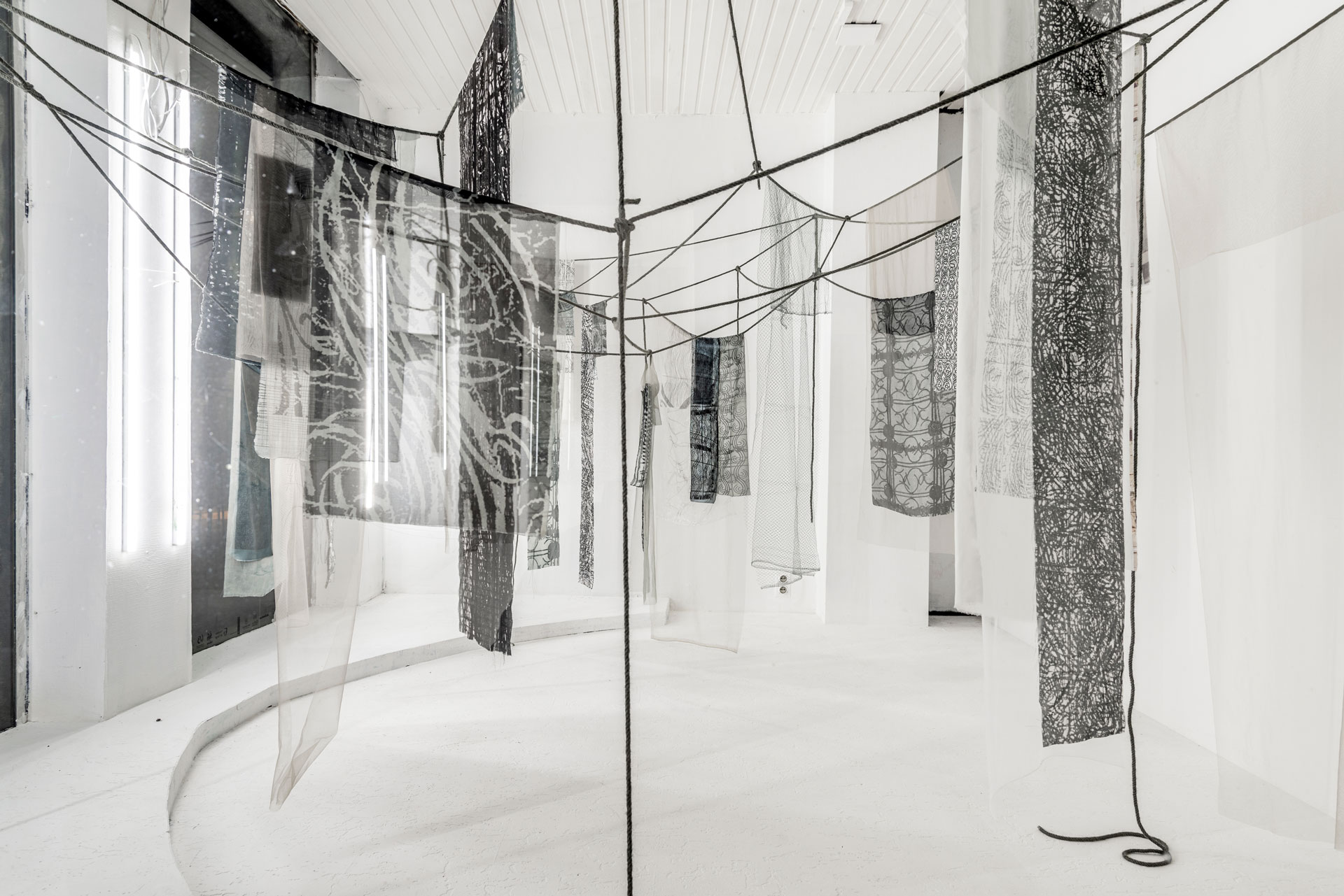 Die Möglichkeit einer Insel, Berlim. Impressão digital sobre chiffon tingido à mão e corda, dimensões variáveis. Foto: Stephanie Kloss. Cortesia da artista.