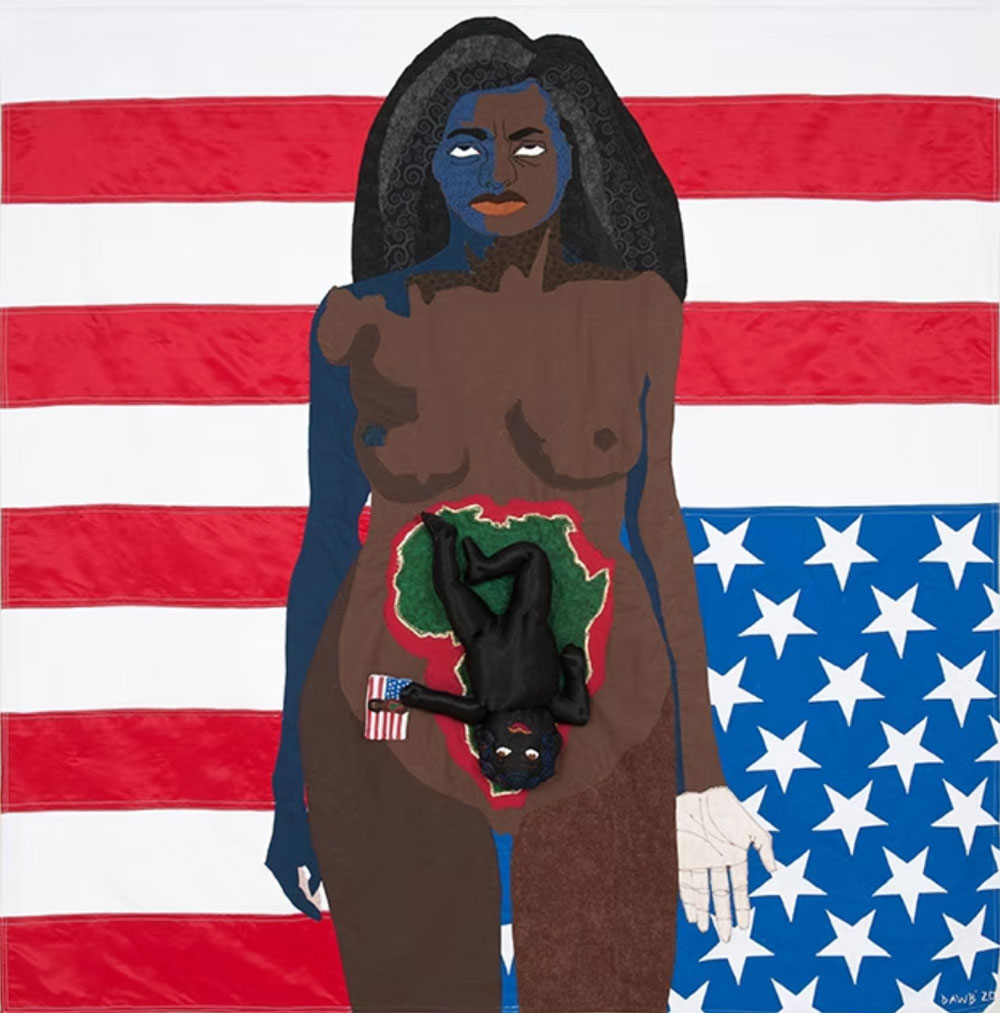 Aplicado à máquina; bordado e quiltado à mão, 91,4 × 121,9 cm. Cortesia da Fort Gansevoort Gallery.