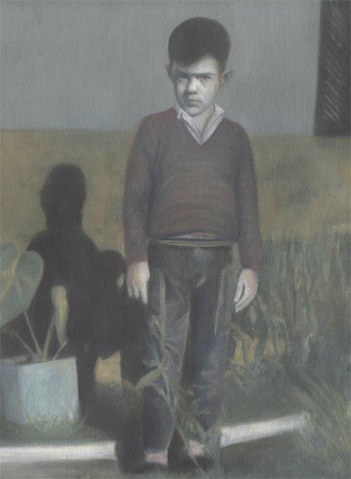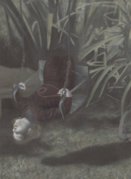 RP: Eu considero esses os meus primeiros trabalhos, apesar de ter começado a pintar muito cedo, quando eu tinha onze anos. Eu sempre pintei, mas entrei na Faap [para cursar Artes Plásticas], em 2004, depois de ter feito Artes Cênicas, então, era um pouco mais velha do que as outras pessoas. Lá tive mais contato com arte contemporânea e percebi que a pintura que eu fazia era muito ruim [risos]. E foi bom ter percebido isso sozinha, sem precisar ouvir de ninguém porque assim não foi traumático. Eu me toquei que o que eu estava fazendo não fazia muito sentido e parei de pintar. Comecei a fazer vídeo que era mais contemporâneo. Mas sempre gostei de pintar e em 2005 resolvi pintar com zero pretensão, zero intenção de fazer um trabalho de arte mas sim, porque eu sentia que precisava fazer aquilo. E foram essas pinturas que foram para a mostra. Elas eram pequenas, feitas em um bloco de papel porque eu não queria gastar dinheiro com tela. Era só um exercício pessoal que fiz a partir de fotos antigas da minha família. Havia algo naquelas imagens que me inquietava. Eu estava lembrando disso com você esses dias. Uma das fotos era o meu pai segurando um balão antes dele subir, mas a maneira como ele olhava para baixo… não sei, dava uma sensação de sonho. Outra foto era da minha irmã e eu com alguém fantasiado de bicho. Uma roupa muito, muito precária e era meio engraçado porque eu nunca soube se aquilo era para ser um coelho ou um urso. Era um bicho meio disforme que causava estranheza ao lado daquelas duas crianças pequenininhas… E tinha uma terceira foto que era uma menina num balanço. Todas elas tinham uma paleta bem reduzida, porque eu ainda estava tentando entender sobre cor. Eu considerei essas as primeiras pinturas porque foram os primeiros trabalhos que eu expus, no caso nessa mostra anual dos alunos da Faap. E foi importante ver que aquilo fazia sentido para outras pessoas. Fiquei muito orgulhosa.