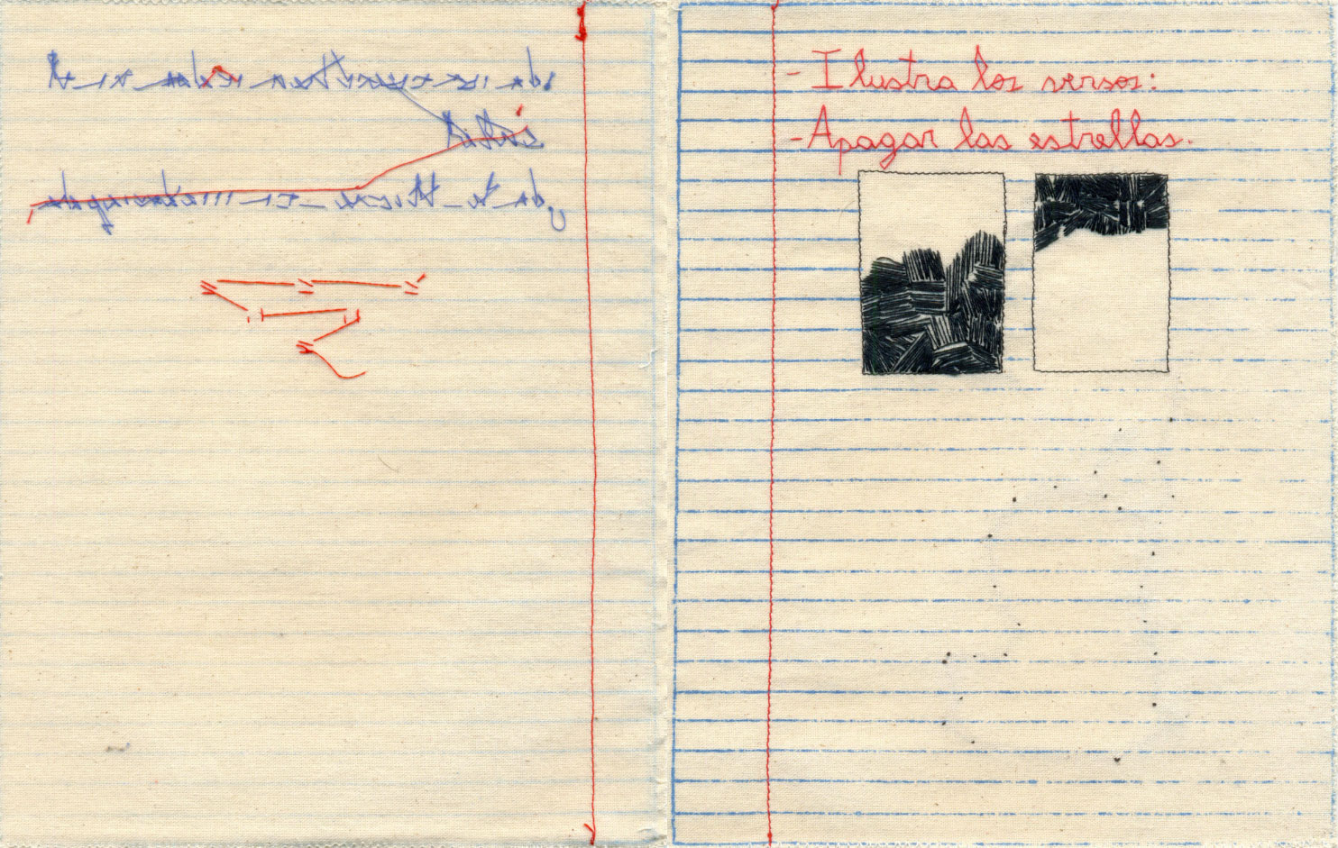 Passou a costurar página após página de cadernos escolares, que acabaram se tornando seus livros de artista. As capas são familiares a muitos peruanos, pois fazem parte do modelo padrão utilizado no sistema nacional de ensino. Apaza explica: “Sinto que, através do caderno, é possível expressar tantas coisas: uma crítica ao sistema educacional, uma crítica à sociedade ou simplesmente o prazer de viver. Rabiscar no meu caderno é algo que hoje posso fazer livremente sobre o tecido, sem ser punida por isso.”