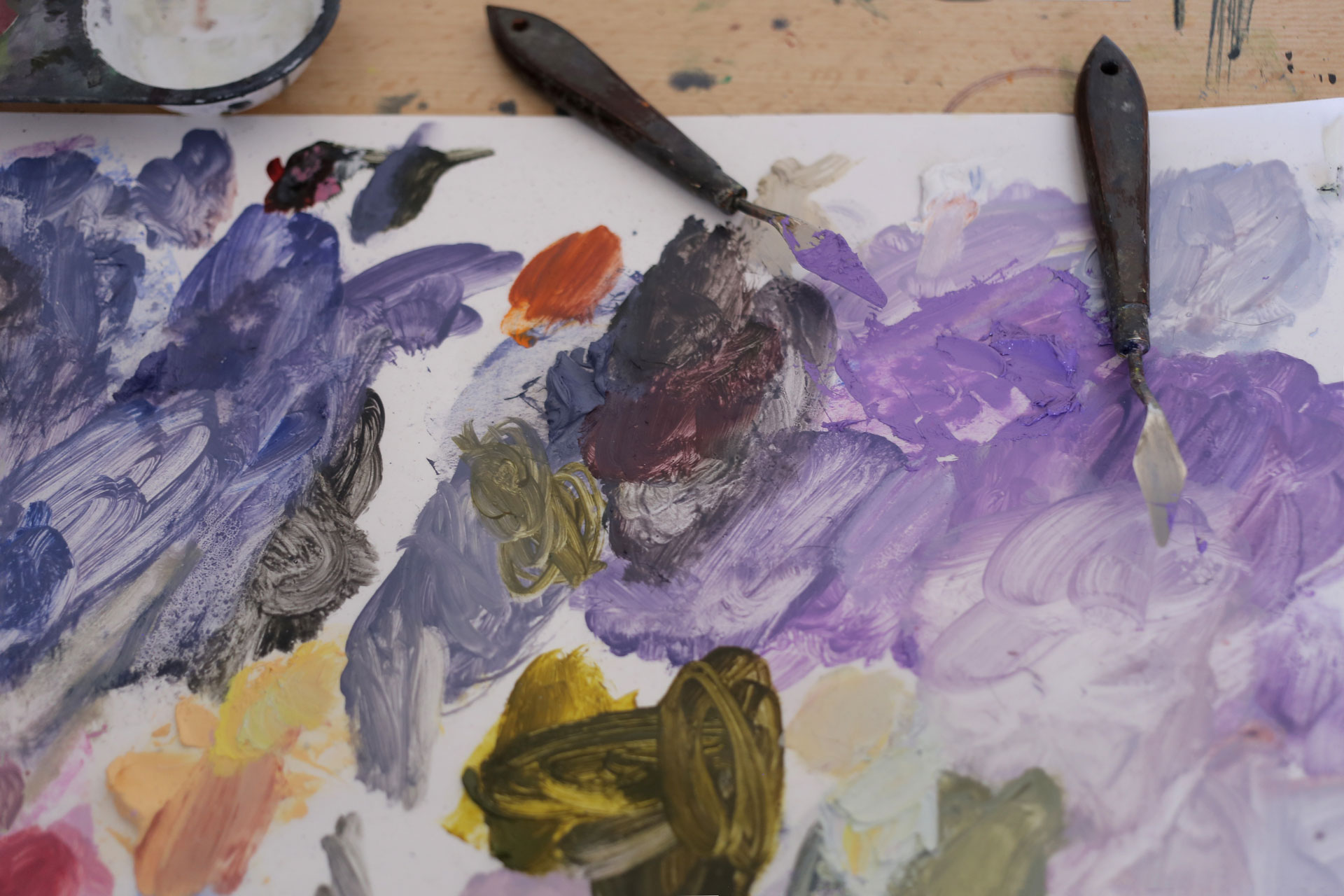 Atualmente trabalho em um estúdio muito pequeno em casa, no Brooklyn, NY. Mudei de São Paulo para cá em 2018 e sinto mais saudade do Brasil a cada ano, especialmente durante o inverno em Nova York quando a luz é tão escassa. Amo a hora azul, essa penumbra em que tudo ainda pode ser visto por um instante antes de desaparecer — se estou em casa, gosto de manter as luzes apagadas até que esteja completamente escuro e observar o crepúsculo banhar lentamente a casa. Consigo fazer isso enquanto desenho, mas para misturar cores a óleo preciso da luz do dia. Todo pintor é um nerd da luz, perseguindo uma luminosidade que vive escapando. A experiência é sempre melhor na lembrança.